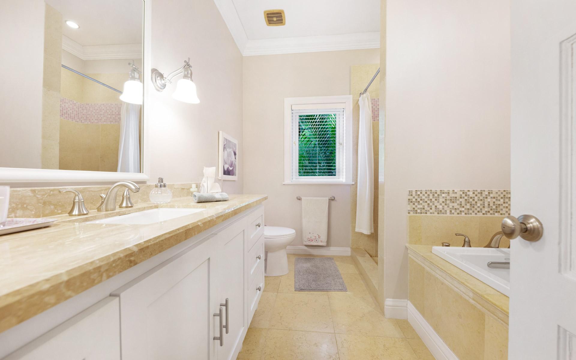 - Floor covering: Travertine, Wood