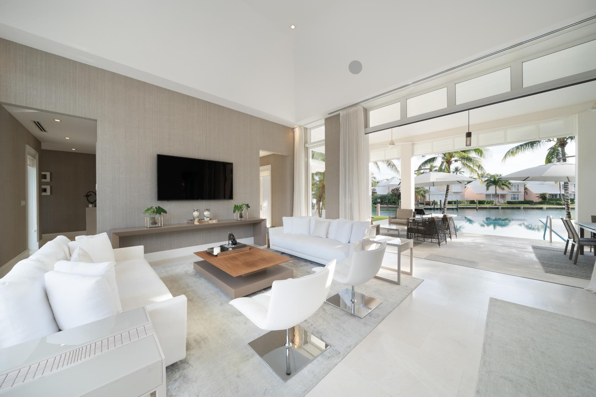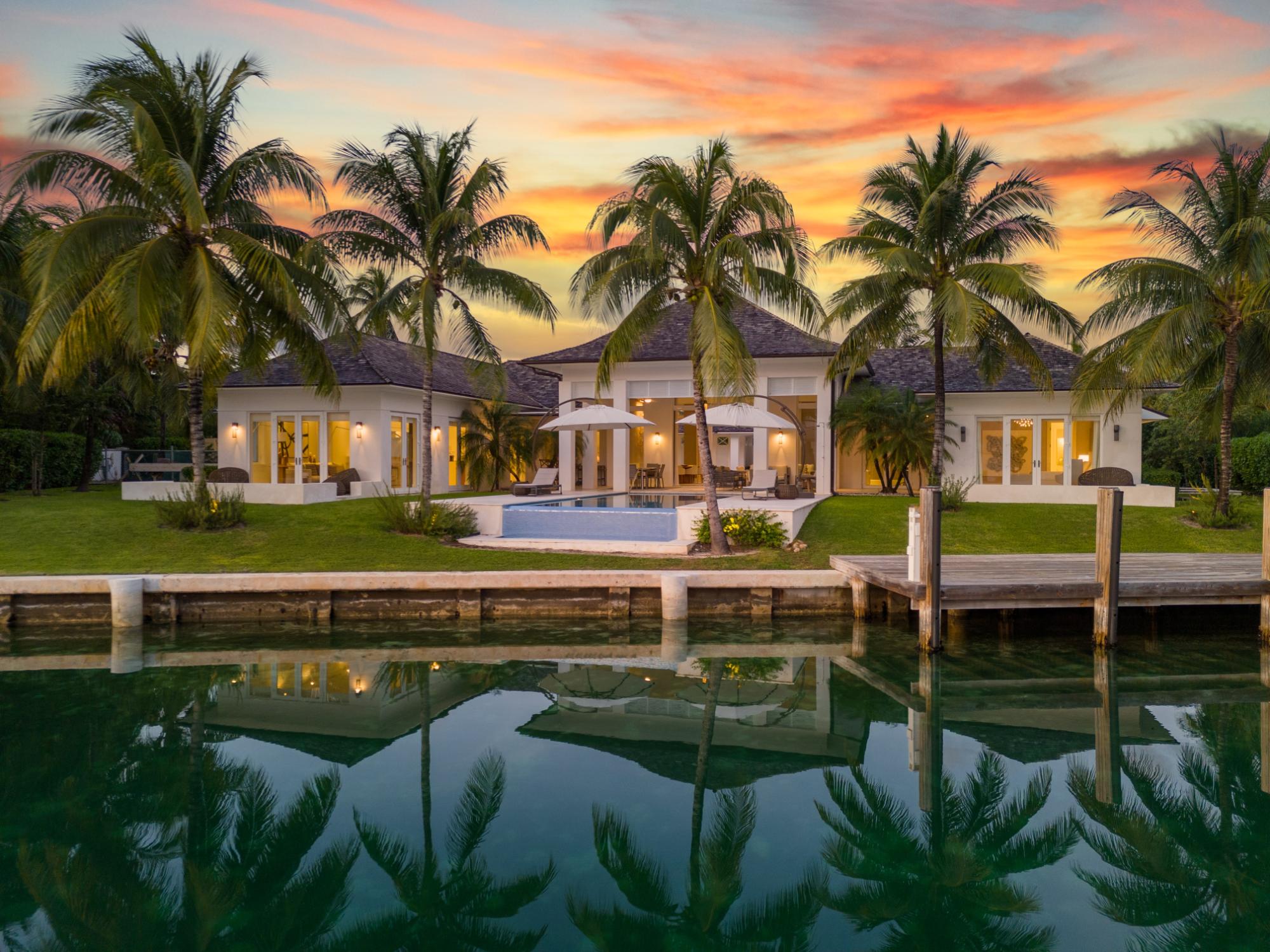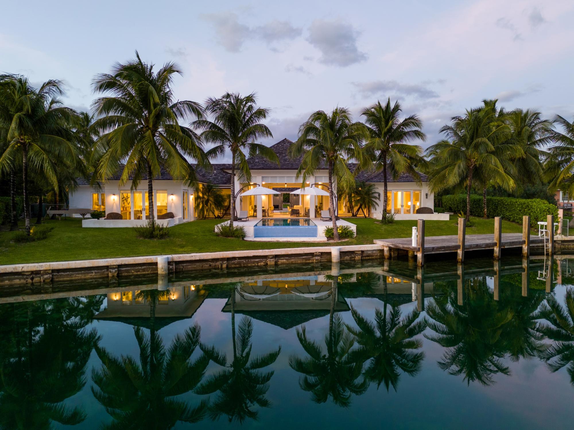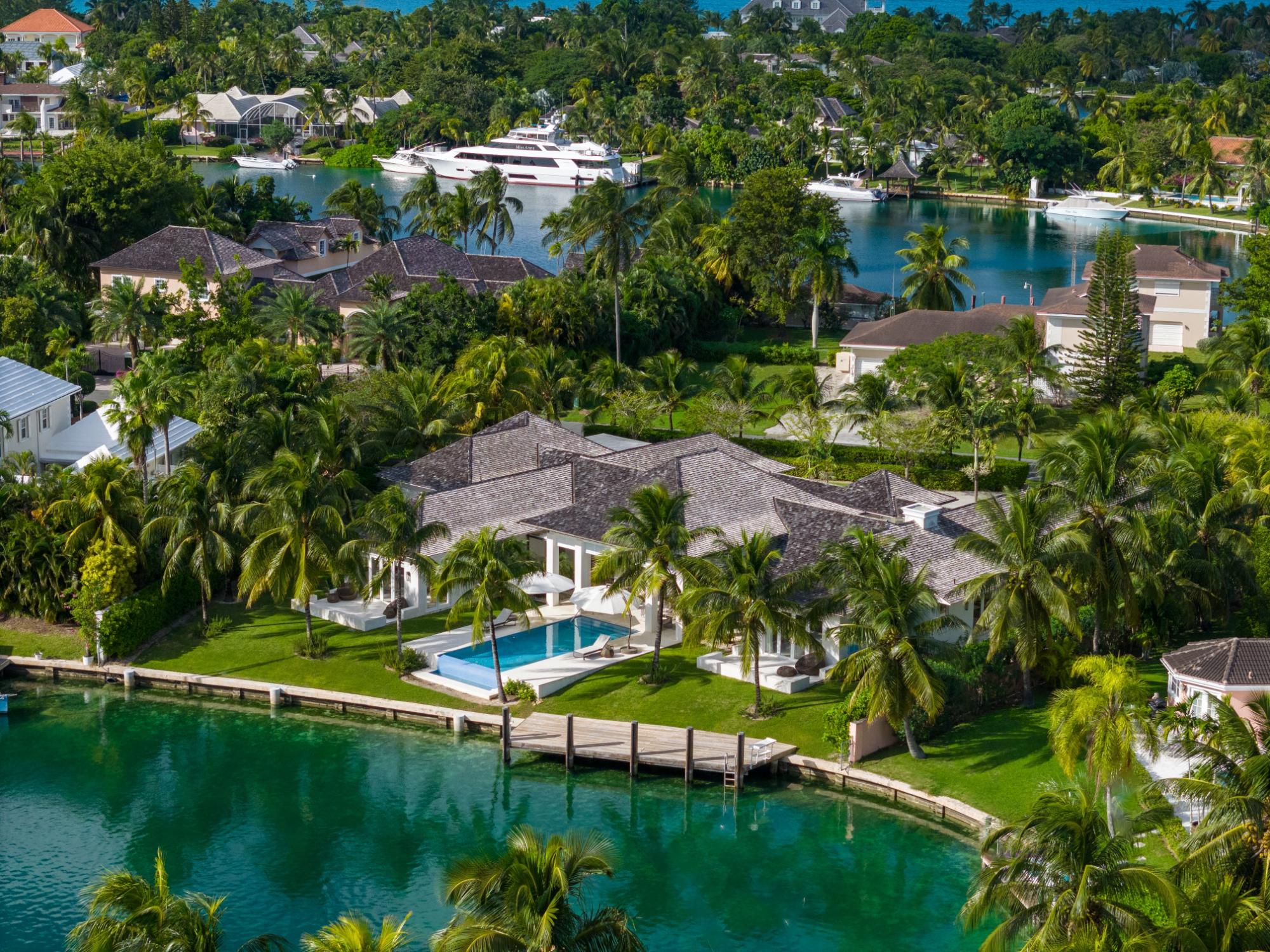Welcome to "3 Aguas," a beautiful, modern residence in Lyford Cay. Located on Shamrock Road, a tranquil âno-through-wayâ street within Lyford Cay, this residence enjoys a peaceful neighborhood feel, while also offering the convenience of being located a 3-minute drive from both the communityâs entrance gate and club. Set on a 30,056 sqft lot, this 7,790 sqft home features a total of 7 bedrooms, 7 full baths and two half baths. Built in 2015 and immaculately maintained, this move-in-ready home comes fully furnished. All windows and doors are hurricane-proof. Each of the 7 bedrooms feature an ensuite bathroom. The primary suite boasts dual walk-in closets, water views and a private patio. One of the six bedrooms has a separate courtyard entranceâwhich makes for a perfect guest suite. Two bedrooms are accessible from the garageâideal for staff accommodations. The residence features a home office located between the living room and primary suite with canal views. The property has 126 ft of canal water frontage and a fixed dock which can accommodate a boat of up to 50 ft.