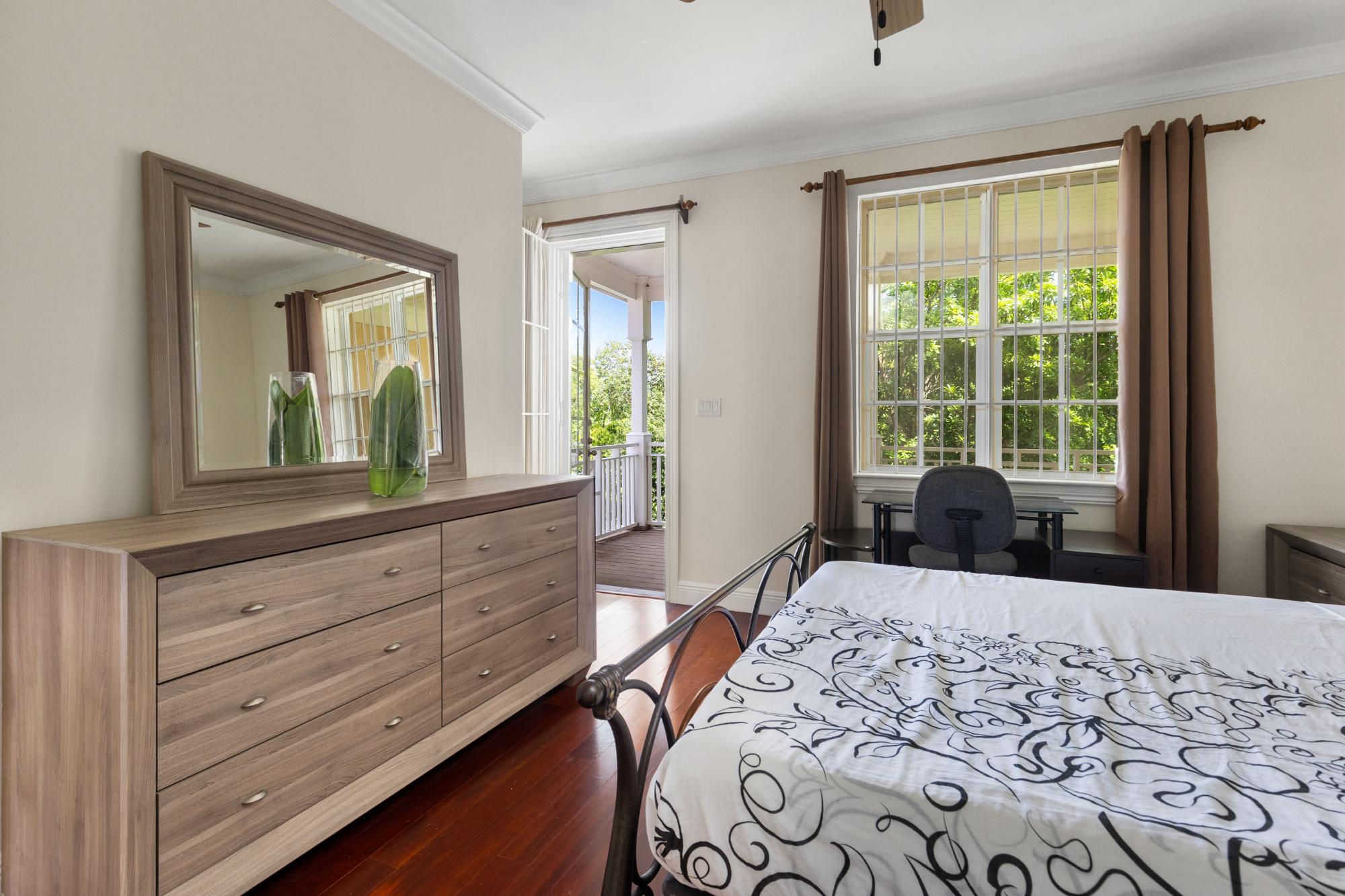Located in the exclusive residential community of The Balmoral, situated on 43 scenic acres on Sandford Drive in the Prospect Ridge area, this property has many unique features. The Balmoral is one of the few developments that is fortunate enough to support many silk cotton trees, with their enormous limb-span and cotton-like seed formations. The Development is a 24 hour gated community with 24 hour roving security , which is augmented by additional security provided by the US Embassy for their numerous residents. The unit has been freshly painted throughout, and comes equipped with security bars which have been installed in accordance with the rigid standards of the US Embassy. The master bedroom is adjacent to a large walkout balcony overlooking the private rear yard, which has been recently freshened up with new sod and plantings. Another large deck walks out to the yard from the main living area. This unit would easily lend itself to live-in domestic help, or accommodation for a senior family member, as there is a main floor 4th bedroom with full ensuite