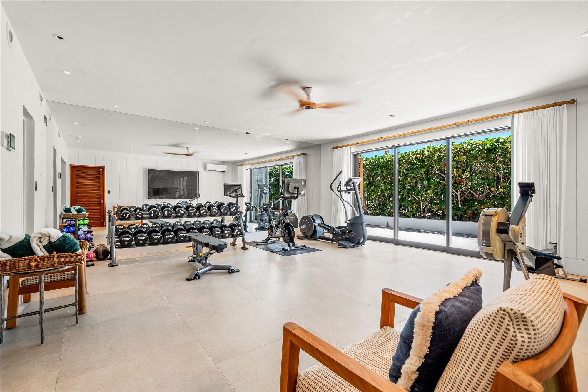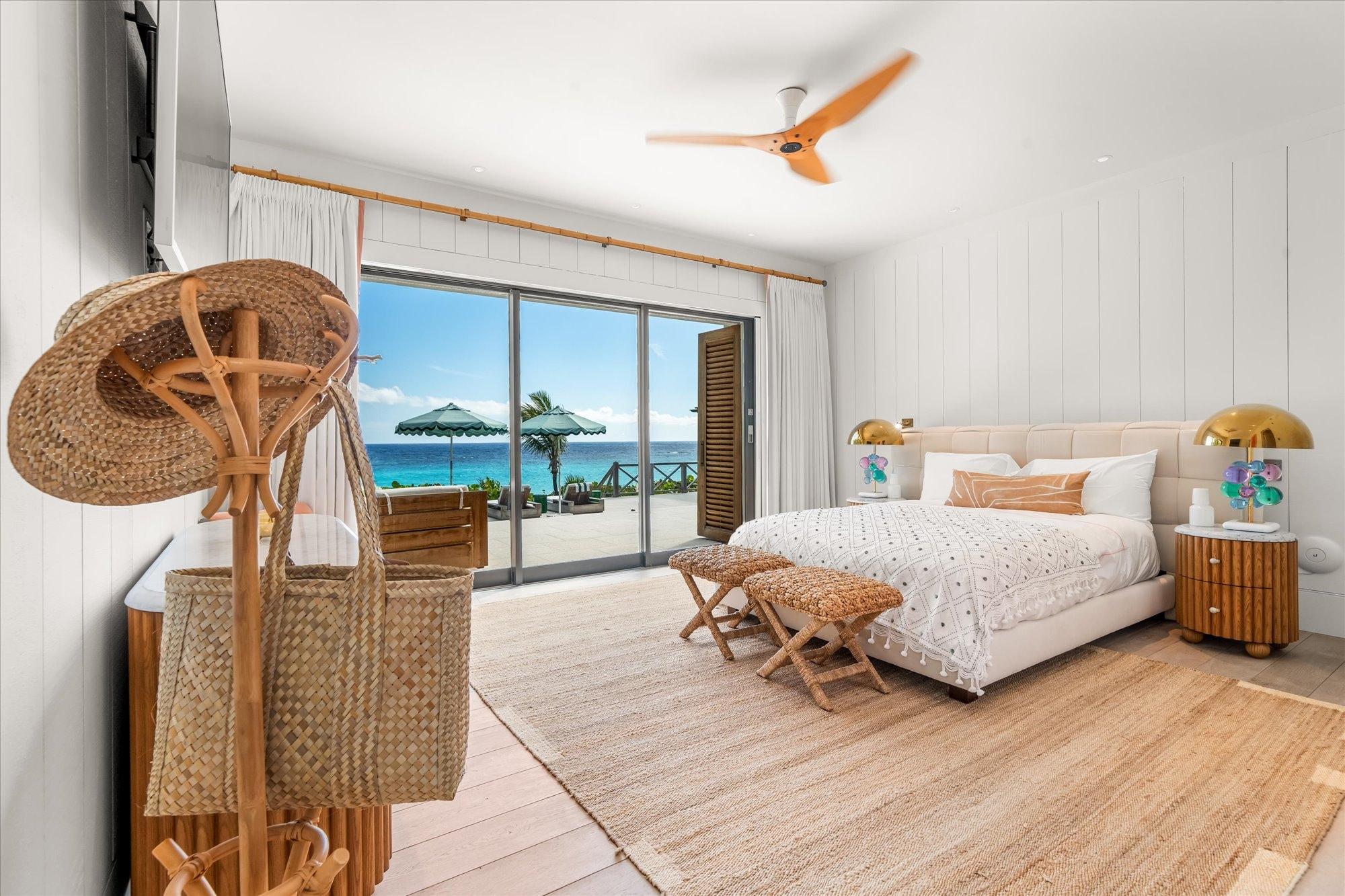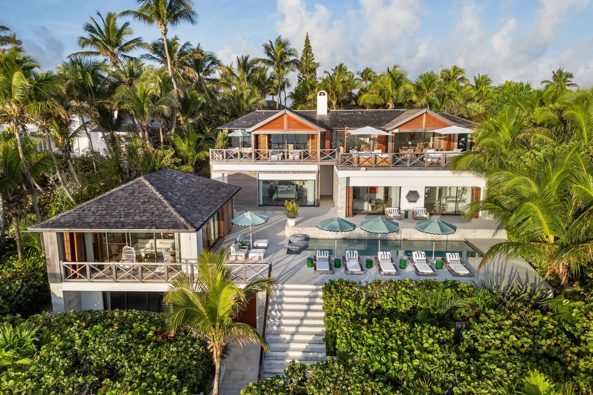 Seafair is a distinguished three-story oceanfront estate set along the world-renowned Pink Sands Beach of Harbour Island, offering approximately 100 linear feet of direct beachfront and sweeping turquoise ocean views. The property features over 5,400 sq. ft. of under-air living space and 6,275 sq. ft. of expansive outdoor decks designed for seamless indoor-outdoor living. The estate includes five ocean-view bedrooms, each with a private en-suite bathroom. An ocean-facing living and dining area showcases a beautifully appointed dining space overlooking the sea, ideal for elegant entertaining. Three gourmet kitchens are equipped with premium Wolfe and Bosch appliances, complemented by dual 180-bottle wine coolers and an additional wine refrigerator. A fully equipped home gym with bathroom offers flexibility and may be easily converted into an additional en-suite bedroom, allowing the home to function as a six-bedroom, six-and-a-half-bath residence.
