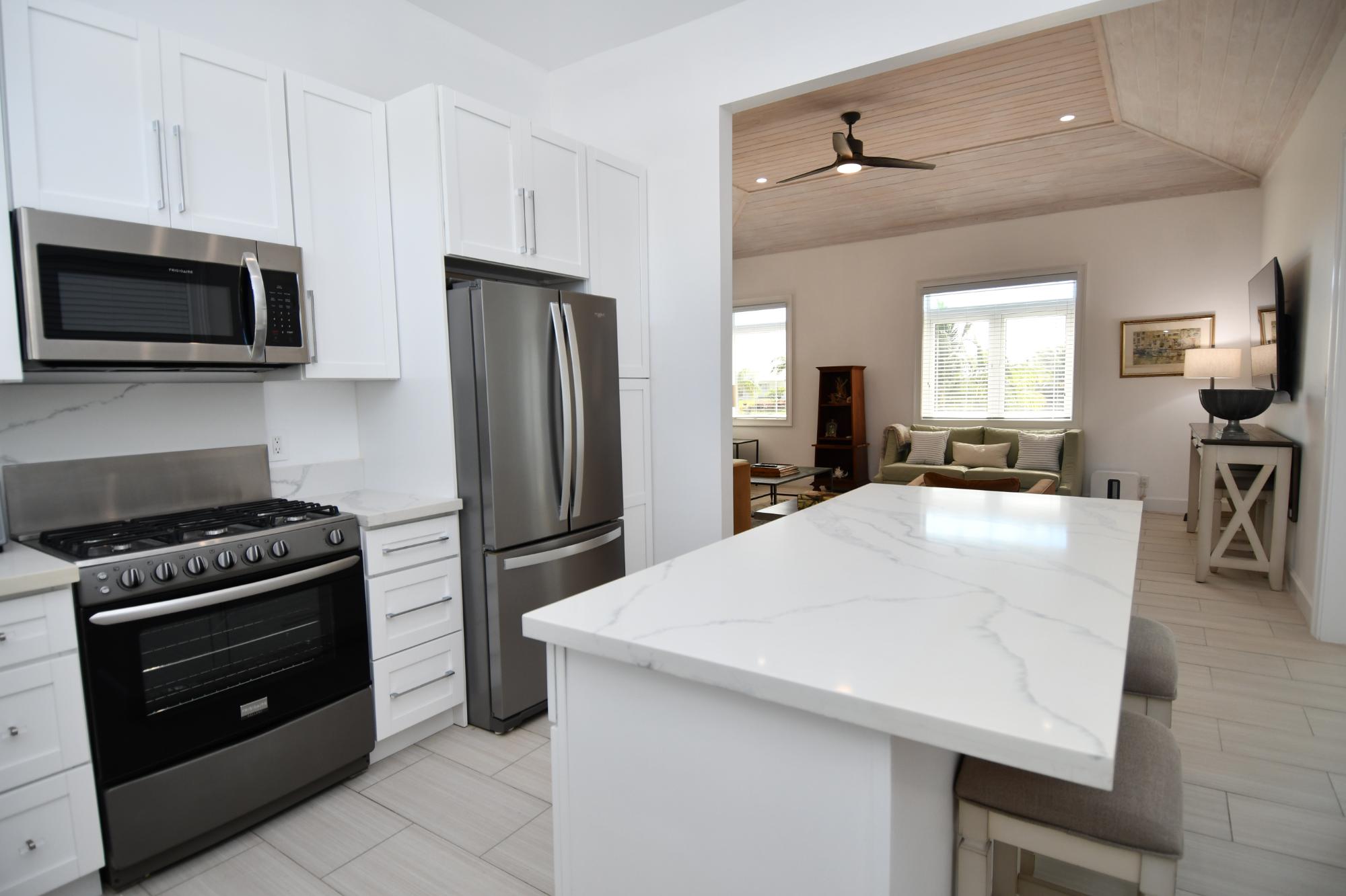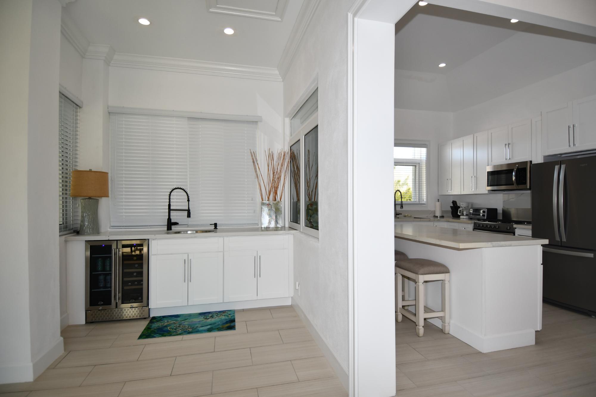 Discover the epitome of modern tropical living in this stunning 2033 sq. ft. single-story residence. With 4 bedrooms and 4 bathrooms, this home offers a thoughtful layout that maximizes open spaces and natural light, creating a bright and airy atmosphere. The chef kitchen is a highlight, featuring sleek white cabinetry, stainless steel appliances, and a large center island ideal for casual dining or entertaining. Enjoy ample natural light and views of the surrounding tropical landscape from the large windows in the bedrooms. The bathrooms are elegantly appointed with modern fixtures and clean lines. A standout feature is the spacious deck, offering an ideal outdoor living space with panoramic views of lush gardens and palm trees. The propertyâs exterior showcases a harmonious blend of tropical vegetation and manicured lawns, creating a serene and inviting environment. This home seamlessly combines luxurious comfort with an indoor-outdoor lifestyle, perfect for those seeking a modern tropical retreat. Additional features include 2 garages, separate laundry and standby generator.