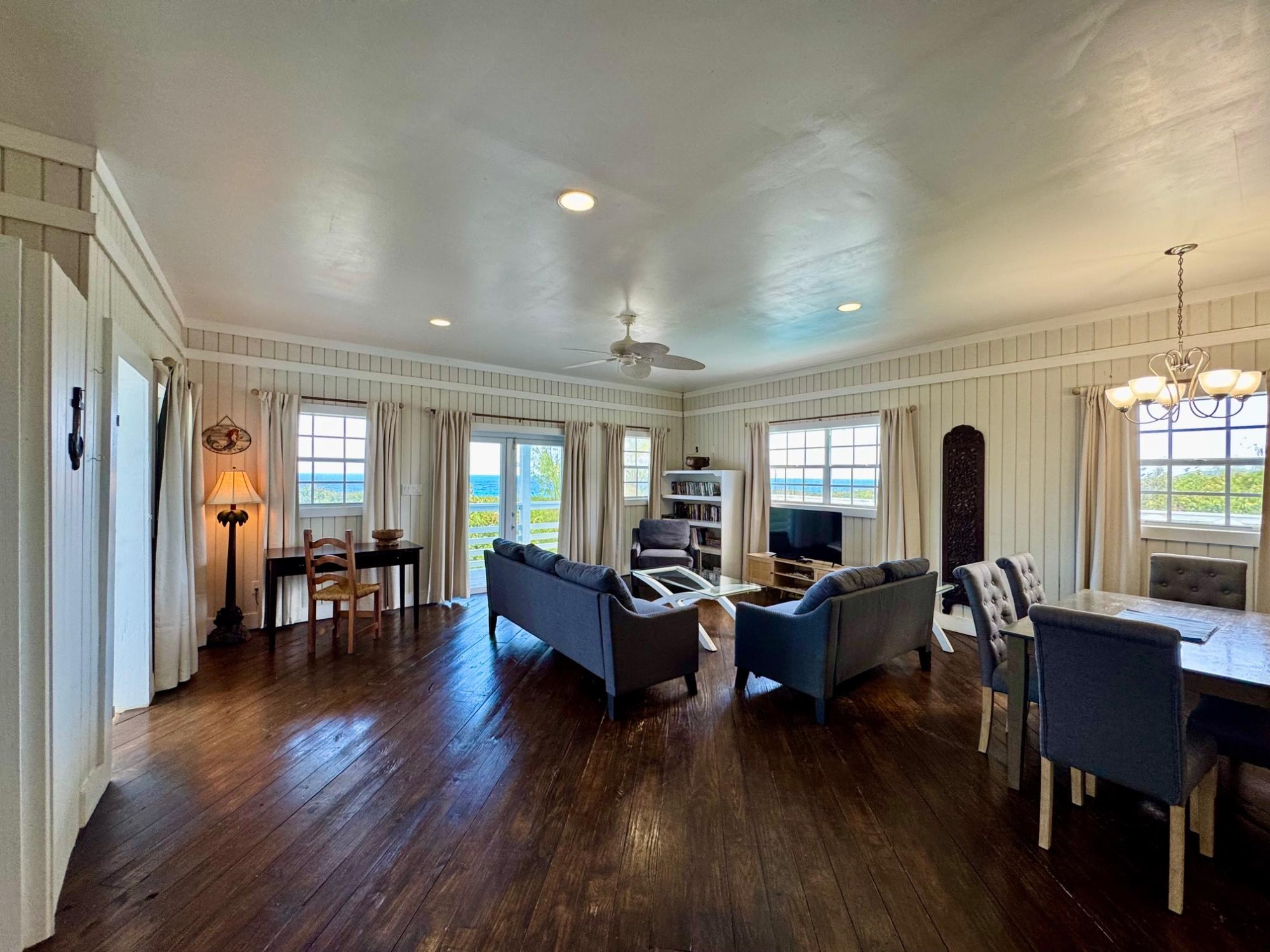 Welcome to Sugar Apple, a charming tropical escape nestled in the heart of Rainbow Bay, one of Eleuthera's most beloved communities. Perched above the Atlantic Ocean, this delightful 3-bedroom, 2-bathroom home offers breathtaking views and an effortless blend of comfort, style, and island living. From the moment you enter the open-concept great room, you're greeted by warm wood floors, a spacious kitchen with a butcher block island, and a seamless flow between indoor and outdoor spaces. Whether you're sipping your morning coffee with panoramic ocean views or hosting friends and family, Sugar Apple is made for relaxed, easy living. Step through the sliding doors onto the wrap-around wooden deck, where a sparkling private pool awaits. The master suite and great room both open to the outdoors, creating a natural extension of the living space and making the most of the stunning views and island breeze. This well-built concrete structure is fully equipped with all utilities and high-speed internet and has a proven track record as a successful vacation rental, making it an ideal investment